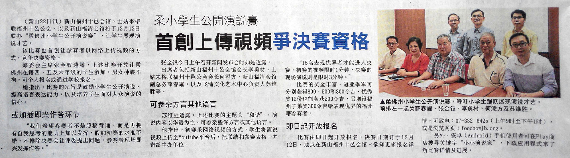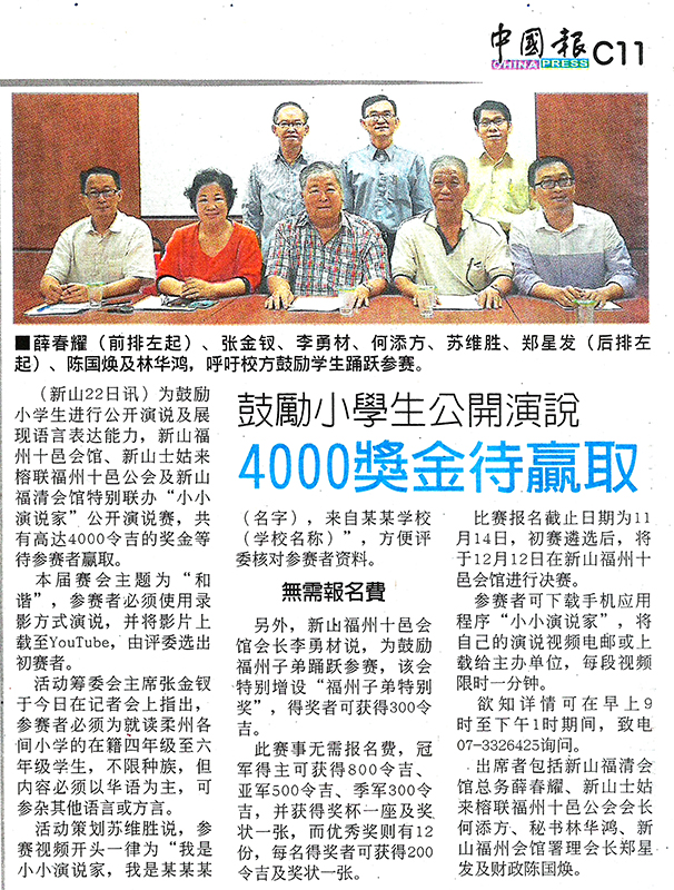 活动 全柔小学生公开演说比赛 – 小小演说家 September 23, 2015June 18, 2016 AdminTeam 由新山福州十邑会馆,新山士古来榕联福州十邑公会,新山福清会馆联合主办,由飞蒲文化艺术中心策划的马来西亚全柔小学生公开演说比赛,已经开始。