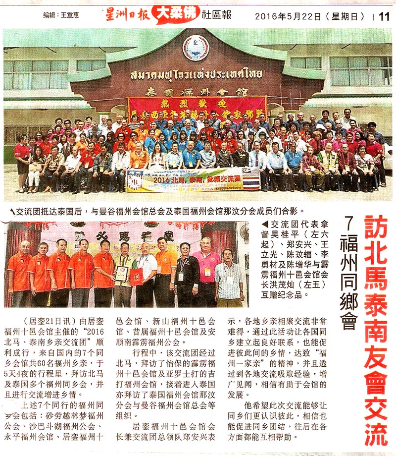由居銮福州十邑会馆主催之“北马,泰南乡亲交流团”,於2016年5月12日至16日北上访问北马及泰国福州乡团,以借此交流访问,加强各友会之间的联系,并对各友会的组及发展有进一步的认识与了解,通过此平台将彼此的距离拉近,并达到互相学习的目的。