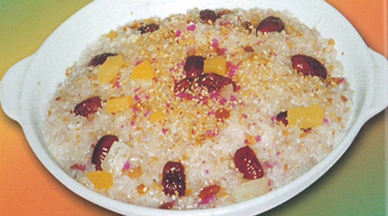 福州美食 福州家常菜 – 八寳飯 June 18, 2012June 20, 2016 AdminTeam 用料: 糯米1斤(約650克),豬油半碗,紅棗10粒, 糖6兩,柿餅2個,葡萄乾半茶杯及少許陳皮。 做法: 1)將糯米洗淨,浸水後,用電鍋煮成飯,取出加 入豬油與糖,葡萄乾,和砌碎之紅棗等攪均。 2)將柿餅砌成兩片,1片置於大碗底,中間另一 片再砌成細條與1/4之葡萄乾及紅棗鋪在碗底。 3)將巳拌好之糯米飯,放入大碗,蒸20分鐘即可。