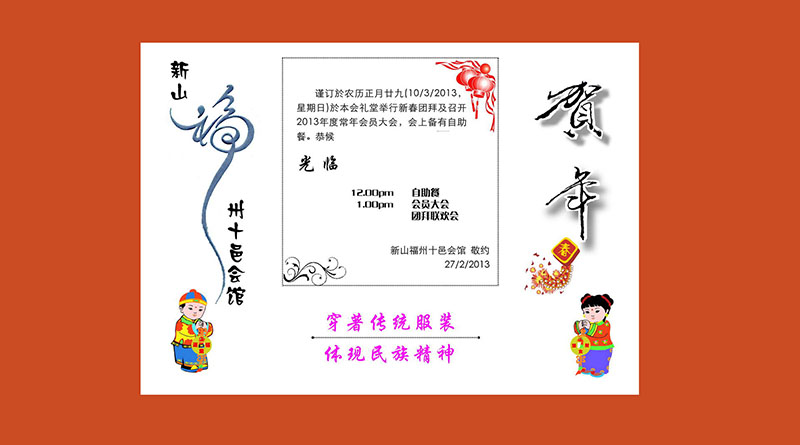 活动 2013年3月10日新春团拜及2013年常年会员大会 March 2, 2013June 19, 2016 AdminTeam 2013年3月10日(癸巳年正月廿九日)星期日 于本会礼堂举行新春团拜及召开2013年度常年会员大会