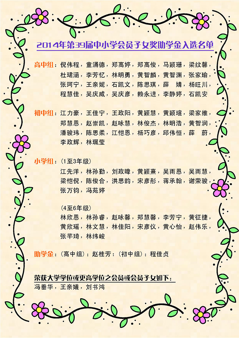 2014年第39届中小学会员子女奖助学金入选名单