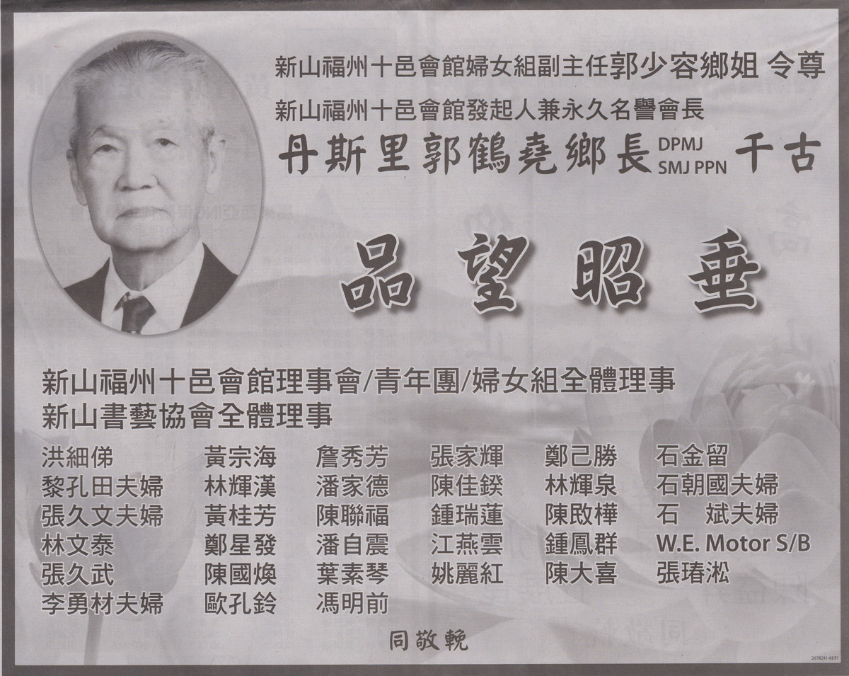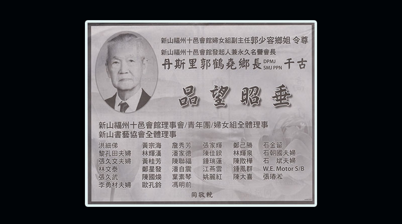 活动 丹斯里郭鹤尧乡长千古 October 24, 2012June 20, 2016 AdminTeam 会馆妇女组副主任郭少容乡姐令尊 会馆发起人兼永久名誉会长 丹斯里郭鹤尧乡长 DPMJ SMJ PPN 千古
