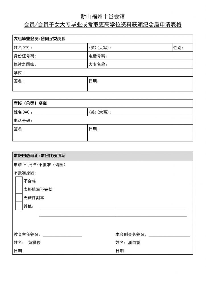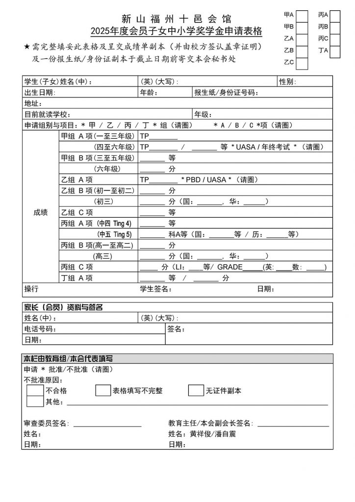 本会2025年度中小学奖助学金由即日起开始接受申请,凡本会会员在籍子女,成绩合乎标准者,皆可提出申请。另,为了鼓励同乡重视子女教育,本会将另颁赠纪念盾予大专毕业之会员或会员子女,凡於 2024年1月以後毕业于本国或海外大专或考取更高学位者皆可申请。