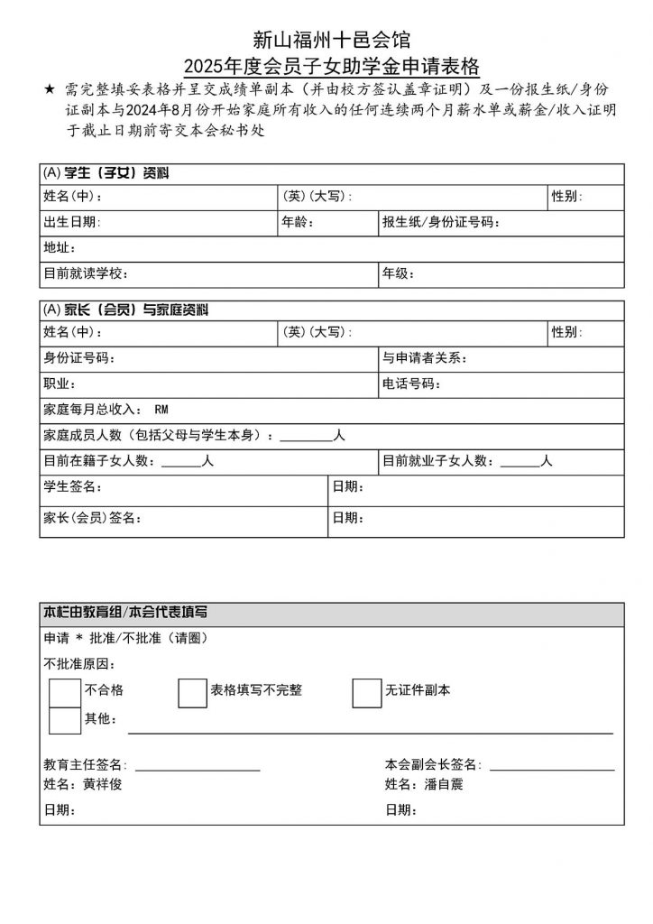 本会也同时发出五份助学金(高、初中生各两名,大学先修班生一名),供家境贫寒之会员子女(所有在籍国中生、独中生与大学先修班生)申请。申请截止日期为 30/4/2025,逾期恕不受理。